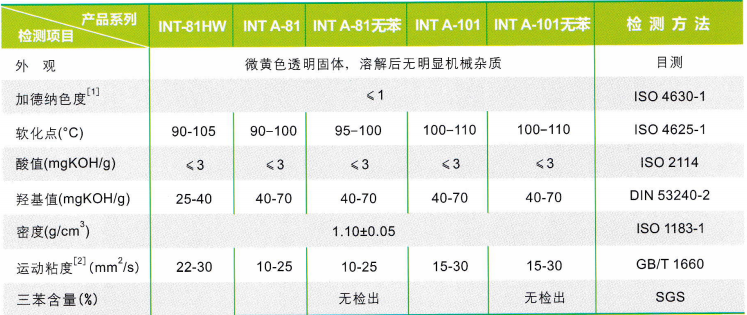 醛樹(shù)脂是一種無(wú)色或者微黃色的醛縮聚樹(shù)脂,不溶于水,能溶于絕大多數有機溶劑,與涂料/油墨配方中的原材料有良好的相容性,具有抗黃變性能。主要用作通用色漿的研磨樹(shù)脂及應用于涂料/油墨配方中,具有良好的展色性,能夠有效提高涂料的附著(zhù)力、硬度、光澤度、固體含量及涂膜的豐滿(mǎn)度。是一種多功能涂料/油墨助劑。根據其不同的性能和應用范圍,醛樹(shù)脂有INT A-81、INT A-81無(wú)苯、INT A-101和INT A-101無(wú)苯系列產(chǎn)品。